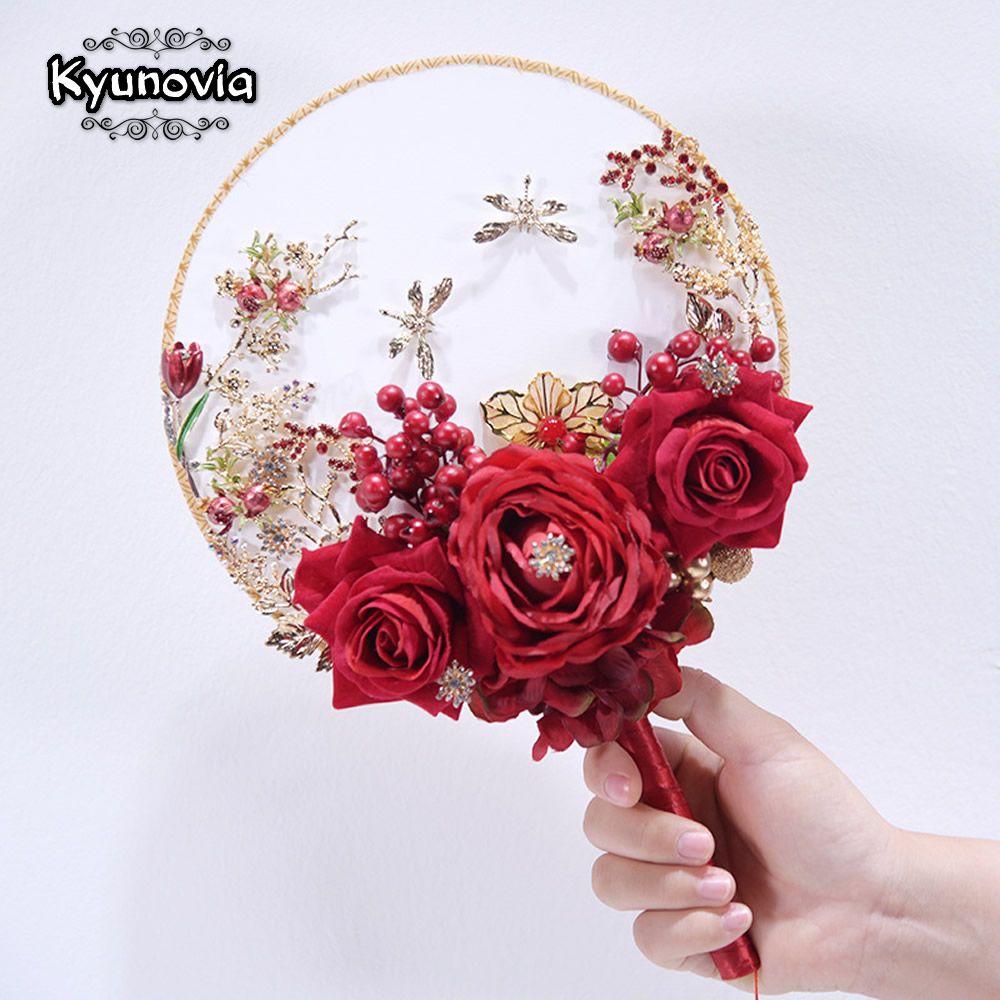 Custom Chinese Pink Gold Fan Wedding Bouquet Fine Elegant Bridal Bouquet