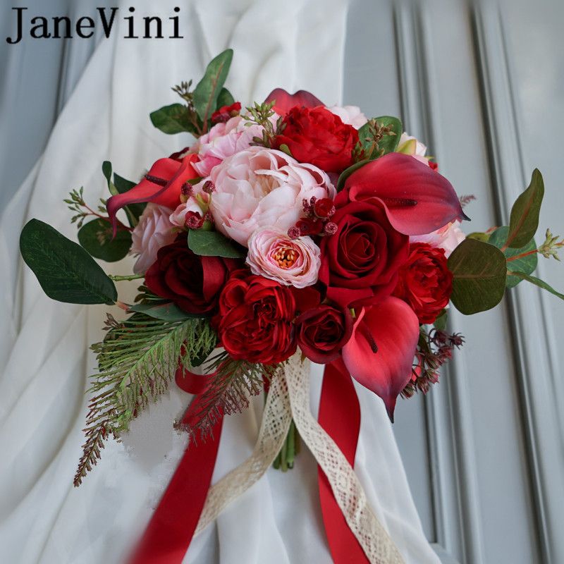 Janevini Red Brooch Brides Bouquet Wedding Flowers Calla Lilies Artificial Faux Roses Pink Peony Bridesmaids Bridal Bouquet Lace Handle