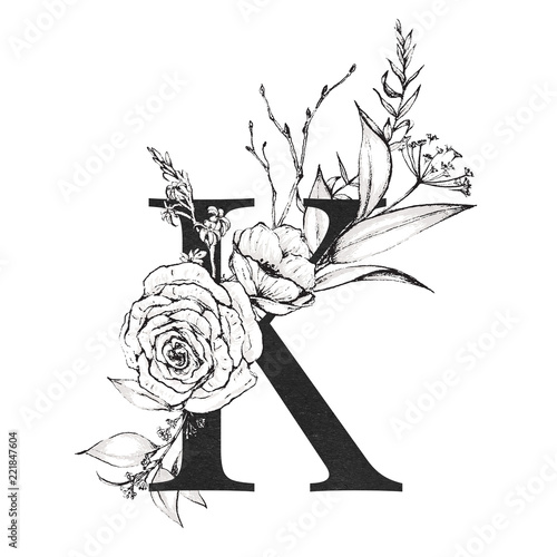 Graphic Floral Alphabet Letter K With Black And White Flowers