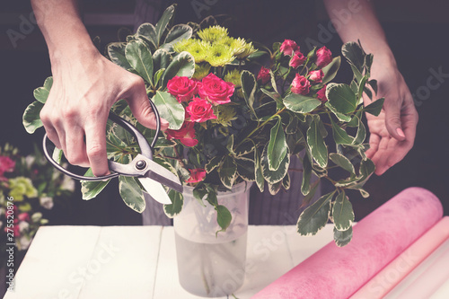 Florist Works Women S Hands Making A Wedding Bouquet Of Roses