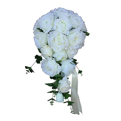 Elegant Bridal Cascade Bouquet Ivory Roses With Rhinestone And Greenery